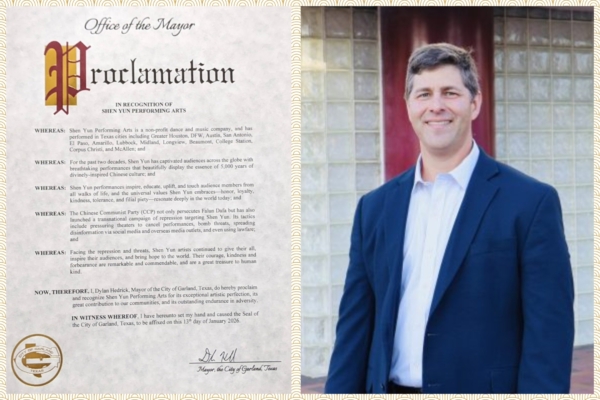 神韻2026演出季開啟前,德州加蘭市市長迪倫‧赫德里克(Dylan Hedrick)褒獎神韻。(大紀元合成)