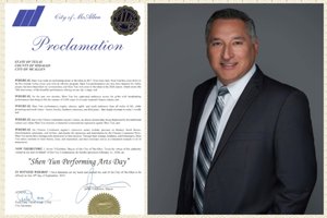 德州麦卡伦市市长哈维尔‧维拉洛博斯(Javier Villalobos)褒奖神韵,宣布2026年2月21日为“神韵日”。(大纪元)