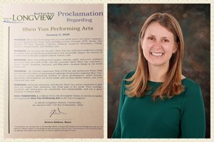 神韵2026演出季开启前,德州朗维尤市市长克莉丝汀‧石原(Kristen Ishihara)褒奖神韵。(大纪元合成)