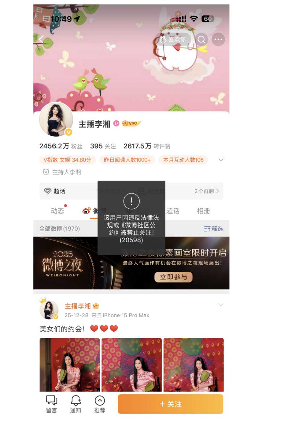 李湘的多个社媒平台被禁止关注,引起众多网民关注。据陆媒《极目新闻》联系各社交平台客服,小红书方面表示会记录相关情况进行核实处理;抖音客服则称无法查询他人账号被禁止关注的具体原因;微博账号显示提示,“该用户因违反法律法规或《微博社区公约》被禁止关注”。
