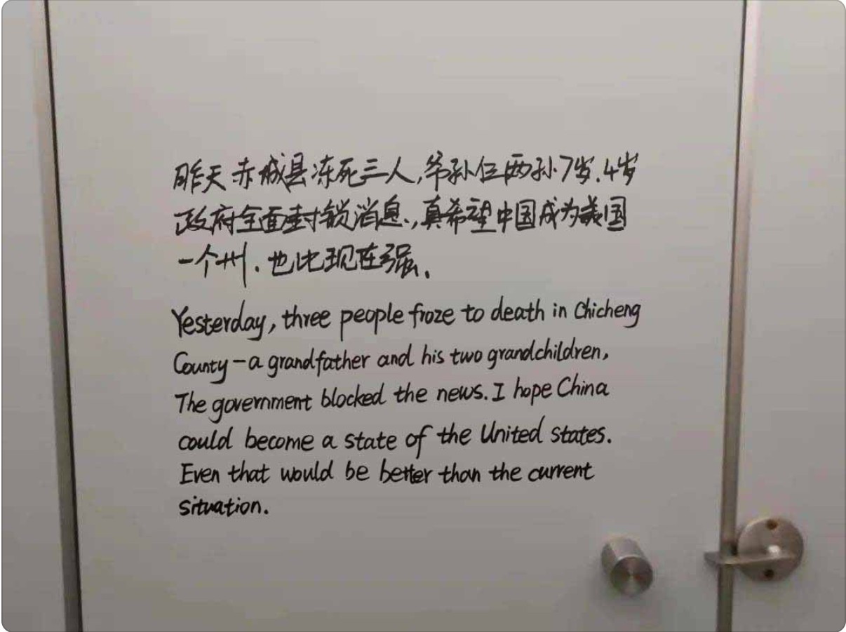 1月6日网上流传的一张图片中,有人用中英文在一扇门的背面写了一段话,内容是:“昨天赤城县冻死三人,爷孙仨,两孙7岁、4岁,政府全面封锁消息,真希望中国成为美国一个州,也比现在强。”