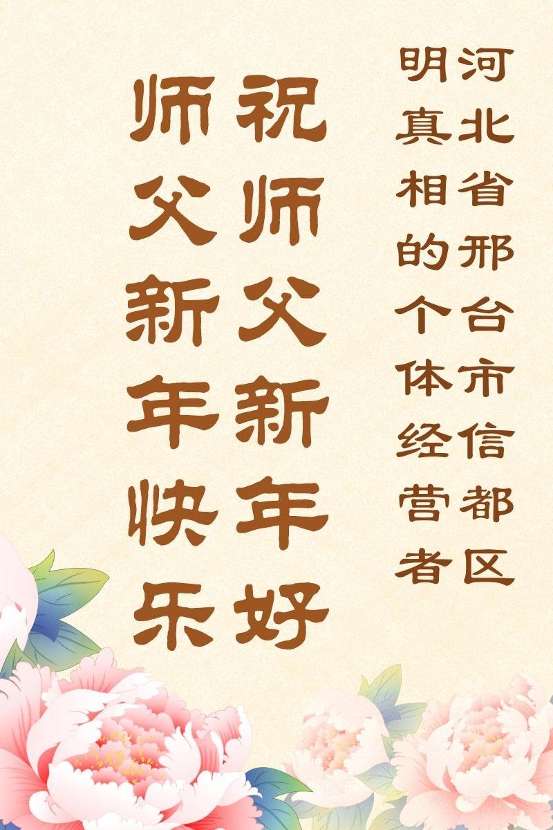 河北省邢台市信都区明真相的个体经营者说:「尊敬的大法师父,祝您新年快乐! “感谢您一直以来对我的指导、关怀和扶持,每念及您,都能感受到内心的平静和祥和。在您的教诲和引导下,我慢慢地了解了信仰的深层意义,并学会了如何生活得更有意义。其次,我想感谢您传授的道理,是您引导我走在正义和道德之路上,教导我怎样爱人与被爱。您的言传身教使我深受启发,是您教会我如何宽容、关心他人以及处理困难和挑战。在这个浮躁喧嚣的世界中,您的教诲对我有著无法估量的价值。谢谢您!” 山东省招远一位支持法轮功的经商人说:“恭祝大法师父新年快乐!” “现在当权的都腐败,无官不贪。大法教人按‘真、善、忍’当好人,如果当官的都按大法做,社会风气就不是这样的了,老百姓也好过了。我相信法轮功一定能成功。” 北京市怀柔区杨宋镇明真相的一家五口人写道:“大法师父您好,您的弟子告诉我们在大灾难中保命的好办法,‘法轮大法好、真善忍好’我们天天念诵,周围的人都说我们面色红润,显年轻。我们深知这是大法师父赐予我们的容颜,谢谢您!” 辽宁省黑山县一明真相的八旬老人说:“恭祝李大师新年快乐!我们一家祖孙四代生活美满,身体安康,全是托您的福啊!您是我们的大救星。我代表我们全家人给您送去新年的祝福:祝您在海外一切顺利!” (资料源自明慧网) △