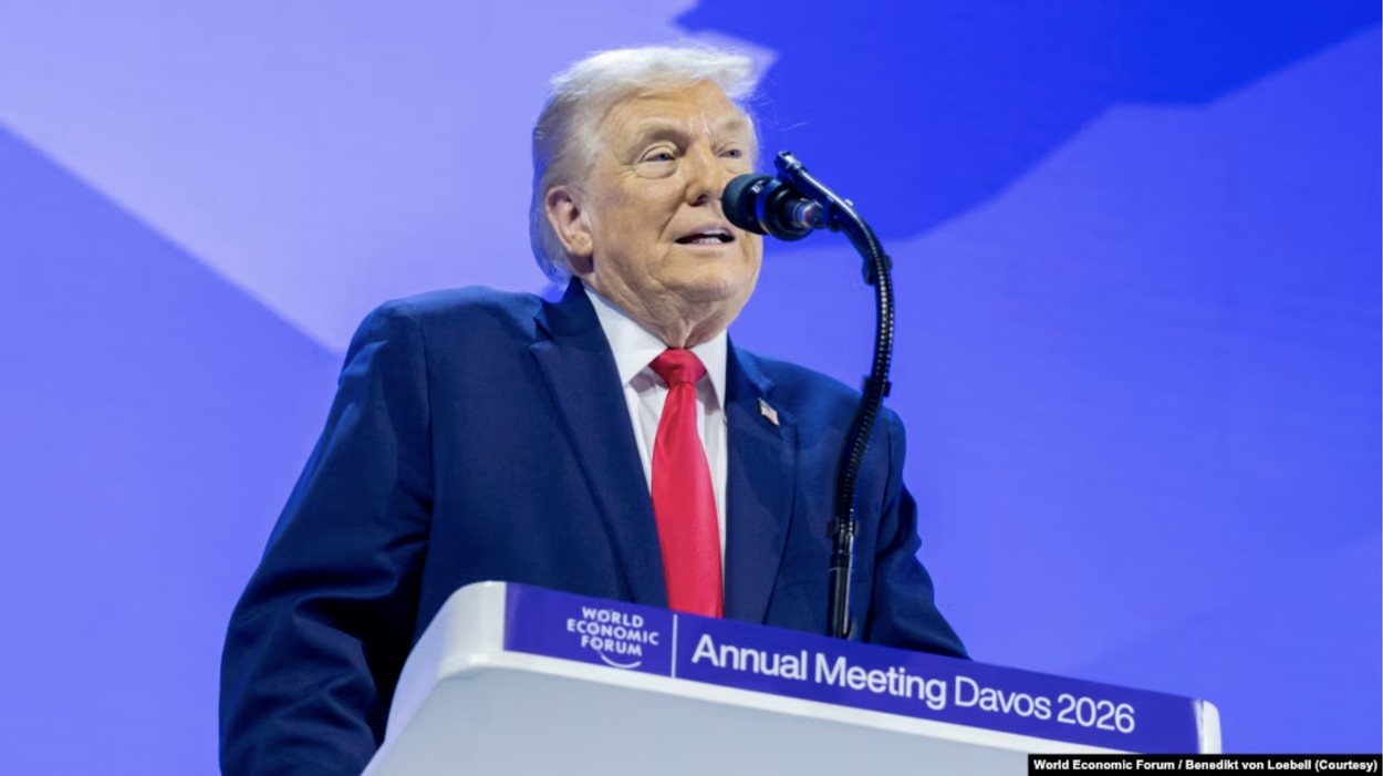 川普總統在瑞士達沃斯舉行的世界經濟論壇上發表演講。(2026年1月21日)