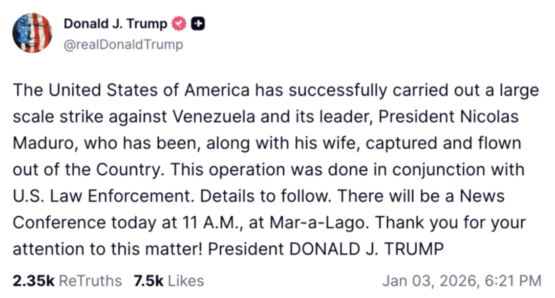 川普總統在社媒「真相社交」上發表的帖文中說:「美利堅合眾國已成功對委內瑞拉及其領導人尼古拉斯・馬杜羅總統發動一場大規模打擊行動。馬杜羅總統及其妻子已被逮捕,並被帶離該國。此次行動是在與美國執法機構協同下完成的。相關細節將陸續公布。」