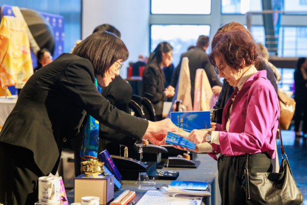 德国首都柏林德意志歌剧院(Deutsche Oper Berlin)大厅内,观众选购神韵商品。(张清飖/大纪元)