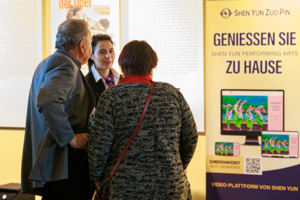 德国首都柏林德意志歌剧院(Deutsche Oper Berlin)大厅内,观众聆听工作人员对神韵作品平台的介绍。(张清飖/大纪元)