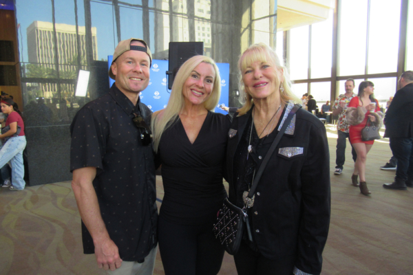 2026年2月8日下午,国际舞蹈比赛创办人Robyn Sharp(右)和女儿、女婿一同观看了神韵北美艺术团在美国加州长滩会展娱乐中心-露台剧院(Terrace Theater)的演出。(姜丽/大纪元)