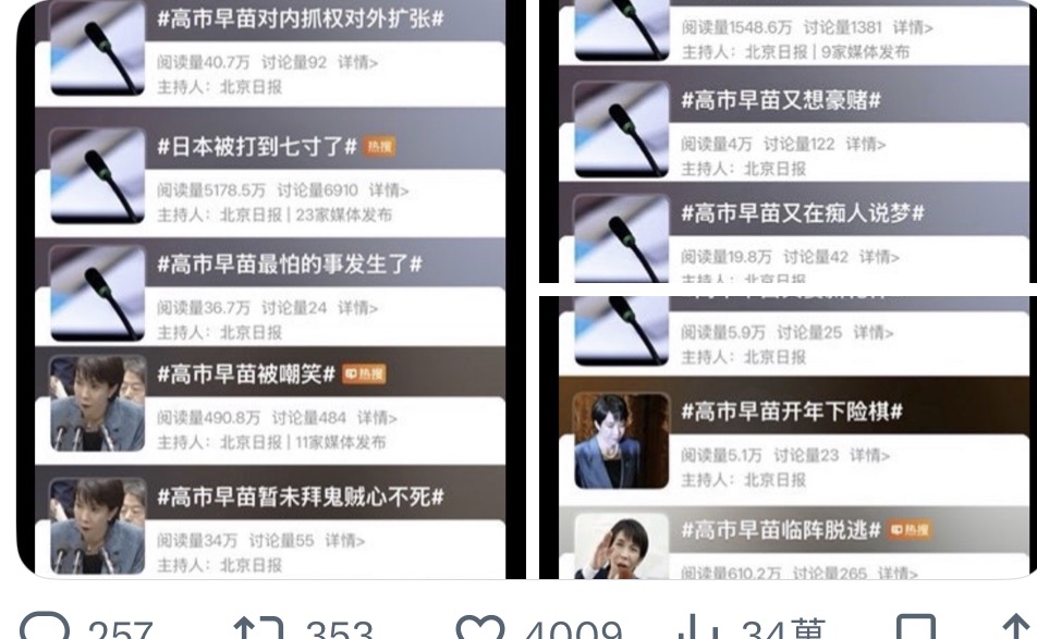 在海外社交媒体上的截图显示,《北京日报》在选后密集发布了一整页针对高市早苗的负面报导。标题充斥著强烈的对抗情绪,包括“高市赢了 日本输了”、“高市早苗赌赢,日本更危险了”、“日本彻底失控”以及“高市早苗人设崩塌”等。