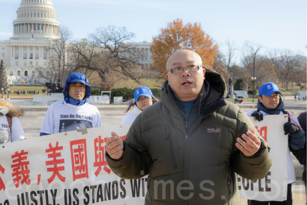 图为2019年12月3日,中国民主党美东党部副主席石宇歌参加集会发言。(林乐予/大纪元)
