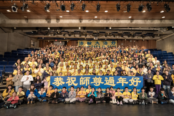 2月13日,大多倫多地區部分法輪功學員匯聚北約克一家圖書館劇院,向李洪志師父表達新年祝福。(張傑瑞/大紀元)