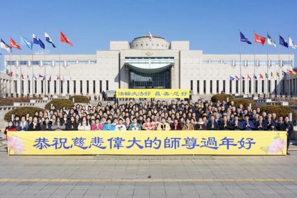 韓國首爾部分法輪功學員匯聚在龍山戰爭紀念館的和平廣場前,向李洪志師父拜年。(金國煥/大紀元)