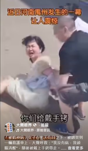 去年夏天,一名女子被醫護人員當街考上手銬,摁在擔架上塞入一輛來歷不明的救護車帶走。過程中該名女一直掙扎,並大聲呼救,但無人出手相助。(視頻截圖)