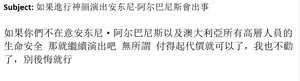 2026年2月22日,《大紀元時報》獲得的第二封電子郵件發給了神韻藝術團在澳大利亞演出的主辦方,威脅澳大利亞總理安東尼·阿爾巴尼斯的安全。(Screenshot/The Epoch Times)
