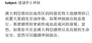 2月22日發送的第二封電子郵件標題為「建議停止神韻演出」。 郵件中寫道:「澳大利亞堪培拉迪肯區的阿德雷得大道總理府已放置大量硝化甘油炸藥。 「如果神韻演出執意進行。那麼總理府會被炸成血流成河的廢墟。當然。如果你不在意澳大利亞總理以及高層的生命安全。當然可以繼續神韻演出。」