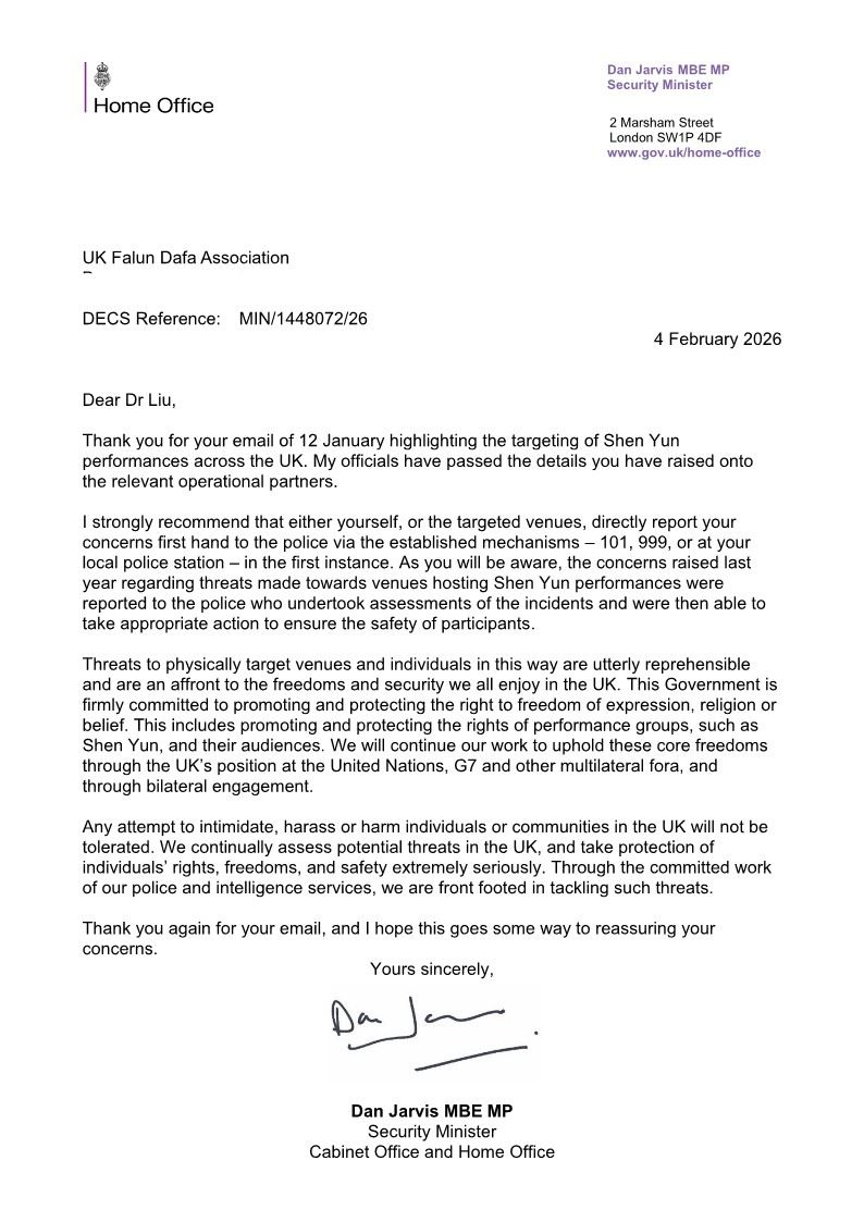 【人民报消息】2026年2月4日,英国安全事务部长丹・贾维斯(Dan Jarvis)议员致函英国法轮大法学会表示,对神韵演出剧场和相关个人,实施人身攻击的威胁行为极其恶劣,是公然侵犯英国社会所共同享有的自由与安全。 贾维斯重申,任何试图在英国境内恐吓、骚扰或伤害个人或社群的行为,都是不可容忍的,英国政府采取积极主动的态度来应对和打击此类威胁。 明慧网报导,这是继1月23日英国外交部致函英国法轮大法学会、明确表达政府坚决反对中共特务以恐吓方式干扰神韵演出的立场之后,英国政府再次就相关问题作出清晰表态。作为英国政府中专门负责反恐、应对外国敌对势力威胁与公众安全事务的高级官员,贾维斯的回函进一步重申了政府在此问题上的坚定立场。 英国安全事务部长:威胁行为极其恶劣 回信中,贾维斯首先回应了神韵在英国演出期间遭到中共特务及其帮凶威胁的情况,并表达了政府层面的高度重视。 他写道:“感谢您于1月12日来信,反映神韵艺术团在英国各地演出遭到针对的问题。我的官员已将您提出的相关情况转交给相应的执法与安全合作部门。正如您所知,去年有关对举办神韵演出的剧院发出威胁的情况已向警方报案,警方对相关事件进行了评估,并采取了适当措施,以确保相关人员的安全。” 神韵艺术团于2006年成立于纽约,以恢复中国传统文化为宗旨,“展示共产主义之前的中国”,其精湛的艺术风格再现仁、义、礼、智、信等普世价值,20年来世界巡回演出,吸引了数百万观众,深受各国主流社会喜爱,但长期以来一直是中共政权攻击的目标。 著名法律学者、原北京大学法律系教授袁红冰2025年6月在美国国会大楼举行的“中共升级跨国镇压”的国会论坛上表示,习近平在2022年底下令的新一轮升级跨国镇压的攻势,首要针对法轮功和神韵,并主要通过“舆论战”和“法律战”来实施。 随之而来的是,近年中共的威胁和干扰加剧,包括死亡威胁、炸弹威胁、以及假冒身分者的暴力攻击威胁,还有中共使领馆发布抹黑文章,以及利用被其渗透的西方媒体,比如《纽约时报》等扭曲事实,攻击神韵,再配以中共喉舌和网军发动舆论攻势。 这些威胁被发送给世界各地举办神韵演出的剧院,作恶者在发出威胁时,通常会冒充政府官员、媒体记者、中国异议人士。 贾维斯严厉谴责针对神韵演出及剧院的恐吓行为,强调英国政府有责任切实保护演出团体及其观众的合法权益。 他指出:“以这种方式威胁剧院和实施人身攻击的行为极其恶劣,公然侵犯了我们在英国所共同享有的自由与安全。本届政府坚定致力于促进和保护言论自由、宗教或信仰自由。这其中包括促进和保护诸如神韵这样的演出团体及其观众的权利。” 贾维斯也谈到政府在维护核心价值观的努力:“我们将继续通过英国在联合国、七国集团(G7)及其它多边机制中的立场,以及通过双边交流,来维护这些核心自由。” 在信函结尾,他再次强调英国政府对相关威胁“零容忍”的态度:“任何试图在英国境内恐吓、骚扰或伤害个人或社群的行为,都是不可容忍的。我们持续评估英国面临的潜在威胁,并高度重视对个人权利、自由与安全的保护。在警方和情报部门的共同努力下,我们始终采取积极主动的态度来应对和打击此类威胁。”