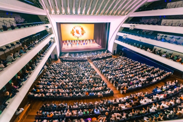 大幕一拉開,祥雲之上仙子翩躚,觀眾立刻送上如雷掌聲。此後整場演出,掌聲不絕於耳,在神韻演員連續展現高難度動作時,觀眾也以連續的掌聲表達讚佩之情。當修煉人堅守信仰的故事呈現在舞台,「法輪大法好」的橫幅再次被展開,觀眾的掌聲也隨之響起,這個節目結束時更是掌聲雷動。
