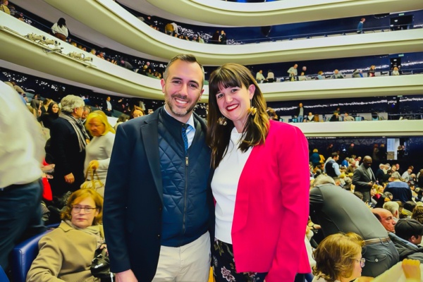 2026年3月7日晚,藝術公司老闆Beatriz Díaz女士與技術經理Carlos Fito López先生在瓦倫西亞的西班牙索菲亞王后藝術歌劇院(Centro de artes escénicas en Valencia, Palau de les Arts) 一起觀賞了美國神韻紐約藝術團本演季在當地的的第一場演出。(Maya Marinova/大紀元)