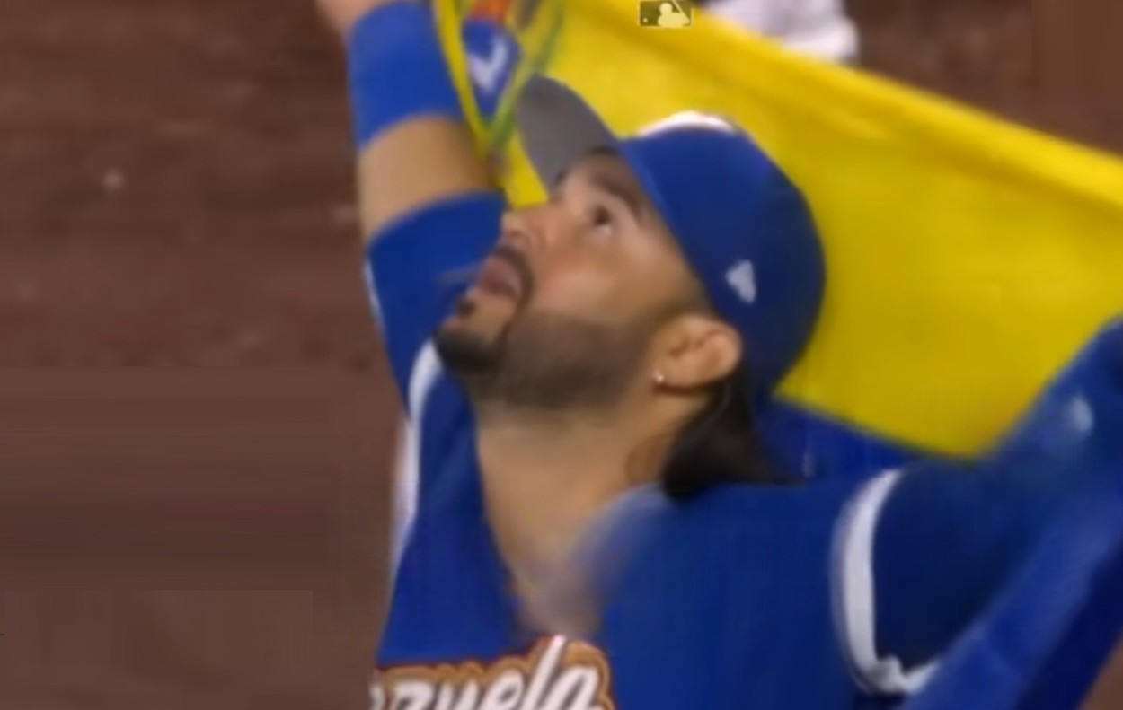 委内瑞拉棒球队赢球后,一名队员披上国旗,高举双臂,跪在地上,仰头感谢上帝。(视频截图)