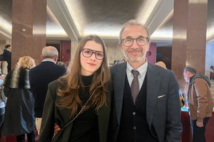 2026年3月19日晚,政府内政部官员Roberto Mattei携女儿Vittoria Mattei一起观赏了神韵纽约艺术团在意大利罗马协和音乐厅(Auditorium della Conciliazione)的第八场演出。(Viviana Del Buono/大纪元)