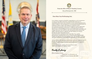 密蘇里州弗洛里森特市長Timothy J. Lowery也向神韻藝術團20週年這一重要時刻致以誠摯祝賀,他寫道:「能夠達成此一里程碑,是一項非凡的成就,也充分展現了貴藝術團堅定不移的奉獻精神、卓越的藝術造詣,以及致力於復興並向全球觀眾傳播中國傳統文化之美的承諾。」