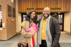 2026年3月25日晚,獲獎製作人Robert Mulolo(右)與女友Ronnie Falana看了神韻國際藝術團在加拿大基奇納中央廣場劇院(Centre In The Square)的第二場演出。(滕冬育/大紀元)