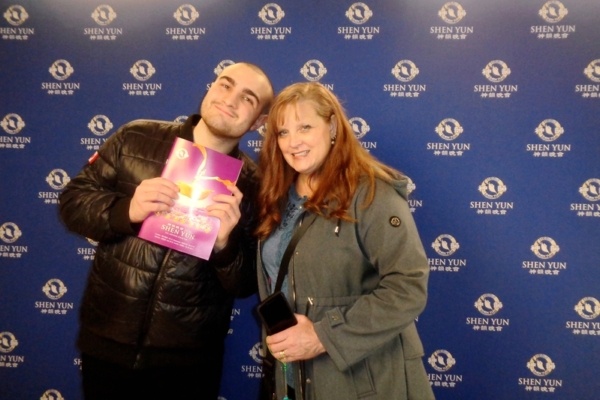 2026年3月25日晚,作家Renna Bruce和兒子觀看了神韻國際藝術團在加拿大基奇納中央廣場劇院(Centre In The Square)的第二場演出。(王蘭/大紀元)