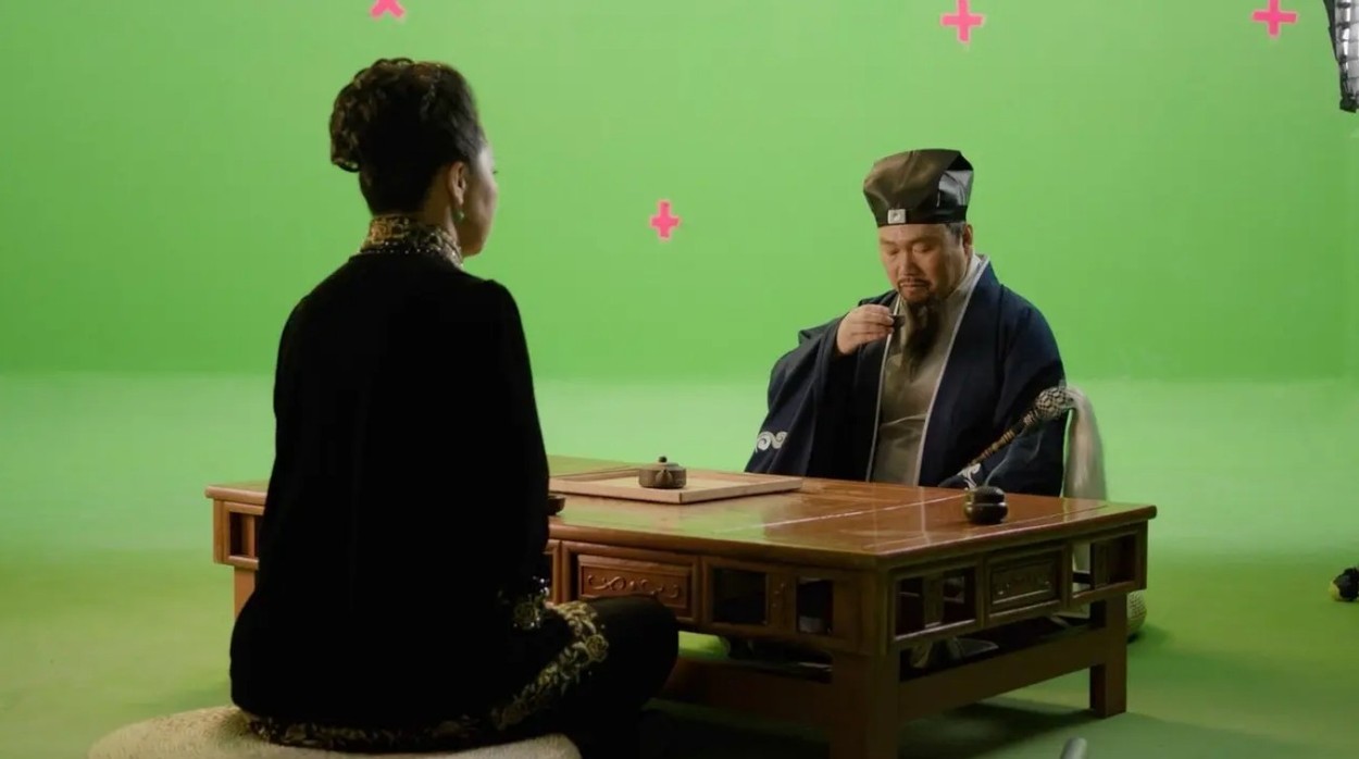 ▲ 第二季工作照:綠幕前的古裝場景拍攝,古典服飾與茶道佈景細節考究。穿越?超現實?還是權力者的黃粱一夢?(圖片來源:新境界影視提供)