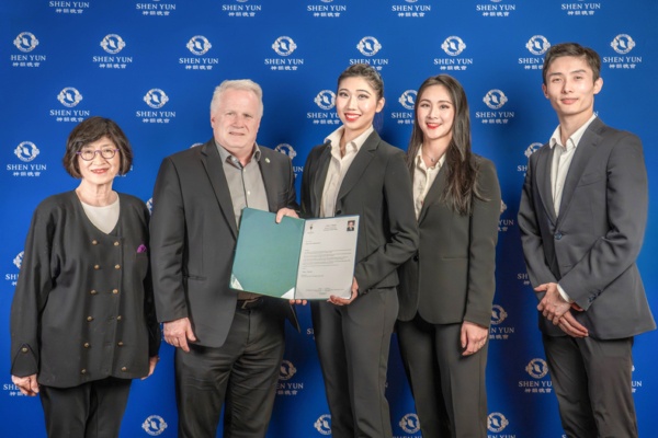 2026年4月10日,國會議員Marc Dalton(左二)親臨劇院,向神韻主辦方頒發賀信,並與神韻演員(右一至右三)合影。(舒璨/大紀元)