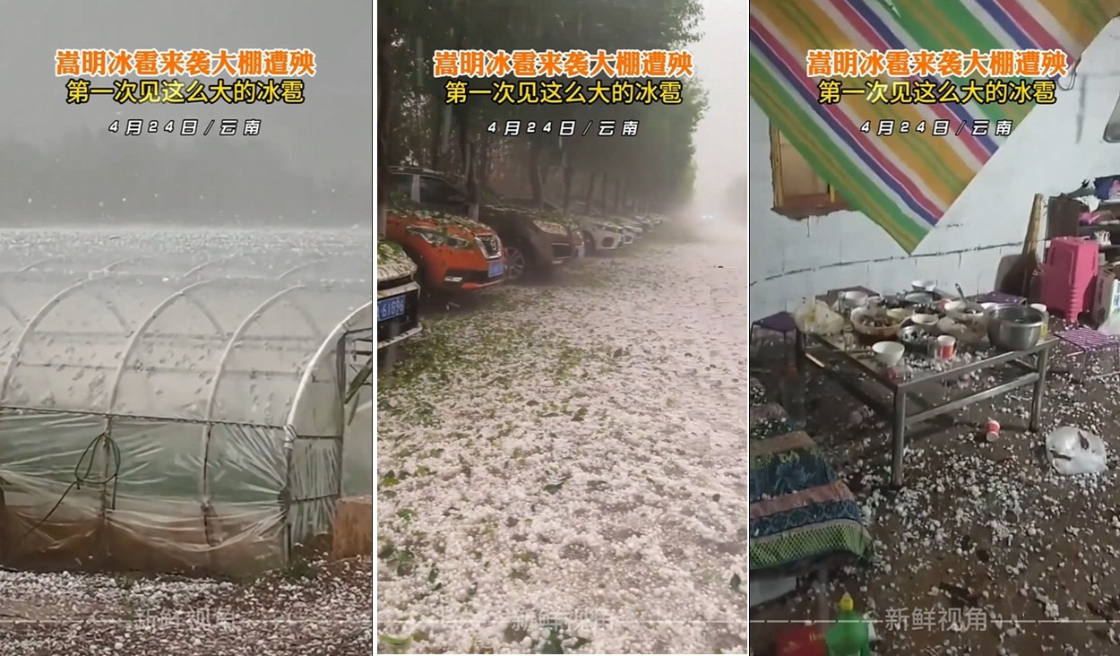 4月24日晚,昆明嵩明、永勝等地突然遭遇冰雹襲擊,雞蛋大小的冰雹,不少車輛前後擋風玻璃被直接砸裂、砸穿,車身受損嚴重。冰雹還砸破了民房的屋頂,農田也覆蓋了一層白白的冰雹,大棚被砸成馬蜂窩,花草樹木被砸爛,大批農作物受損。不少農戶未購買農業保險,賠付困難。在高速路,僅10分鐘就積冰15厘米,場面嚇人。